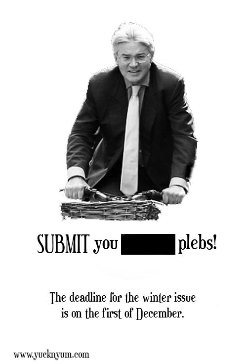 Send us something for our last issue of 2012 by the 1st of December, or we’ll send big Mitch’ after you.