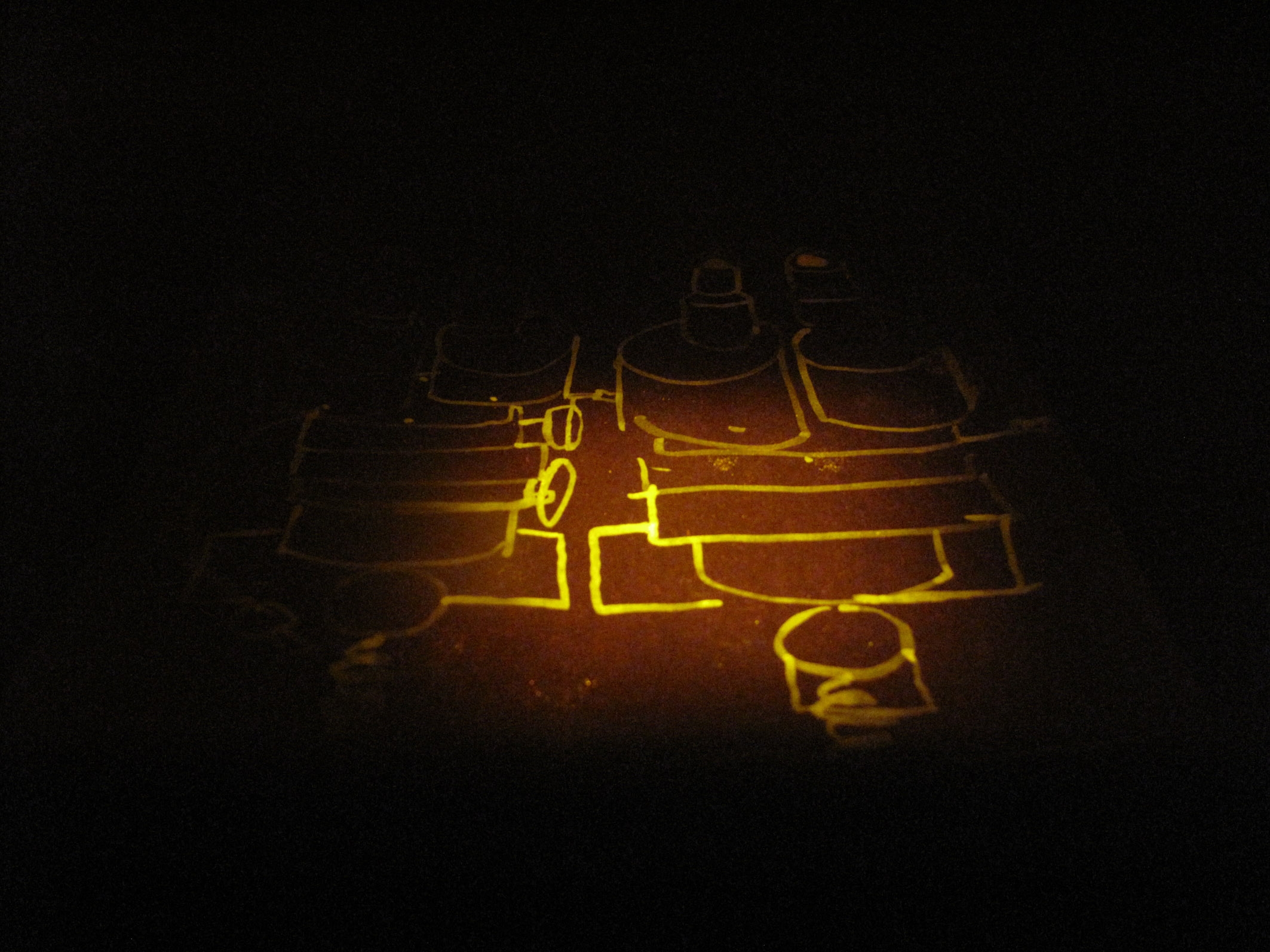 This obsessive need to record traces and seek meaning in them coincides with the very nature of forensics where every detail is important and rich with underlying narrative. Using found objects from the local area and materials commonly used in the forensics lab, Haines wanted the viewer to share the same curiosity and intrigue she felt when watching a fingerprint magically appear under a UV light; that a secret has suddenly been exposed. Working with Dr.Kevin Farrugia, Abertay University, Haines learned how to best visualise minute pieces of evidence using dyes and fluorescent lighting which react with blood and grease from human skin. Artworks appeared to undergo a physical change as a result of scientific alteration.